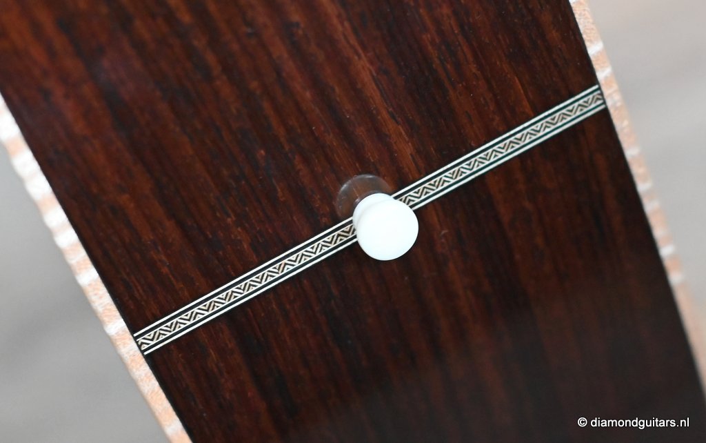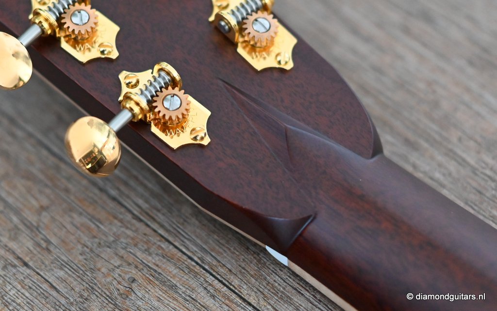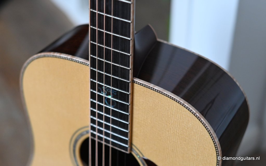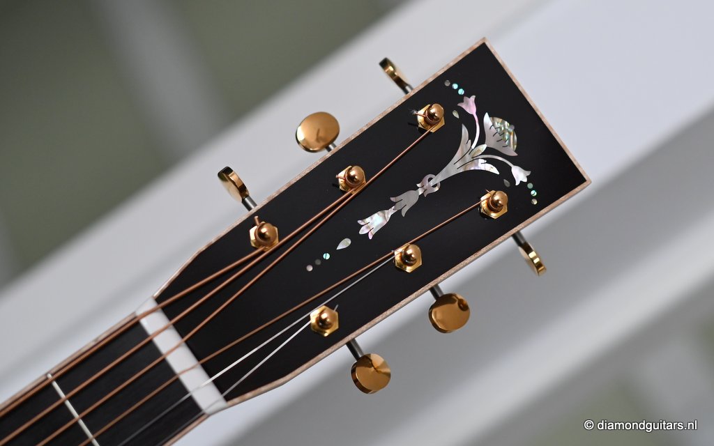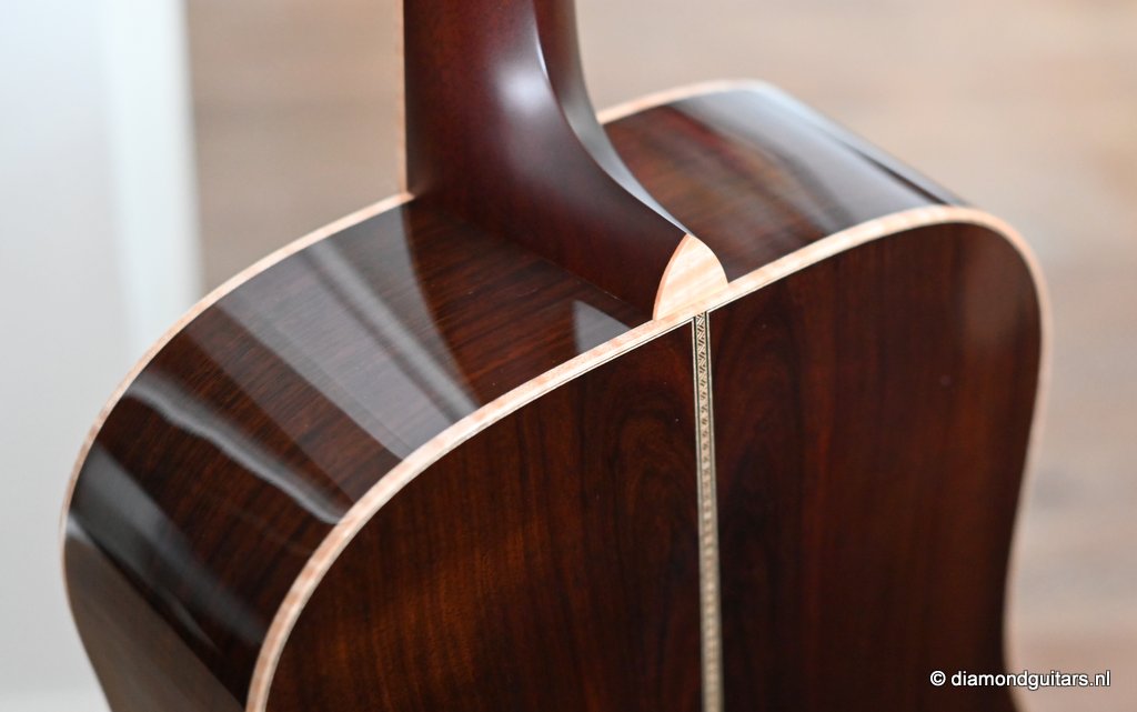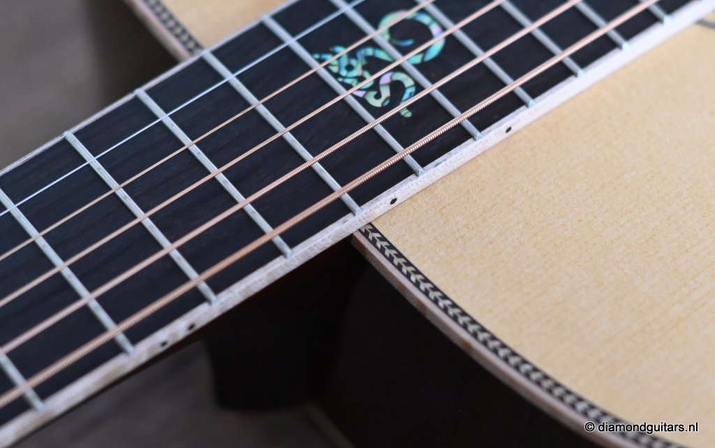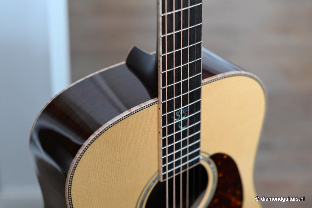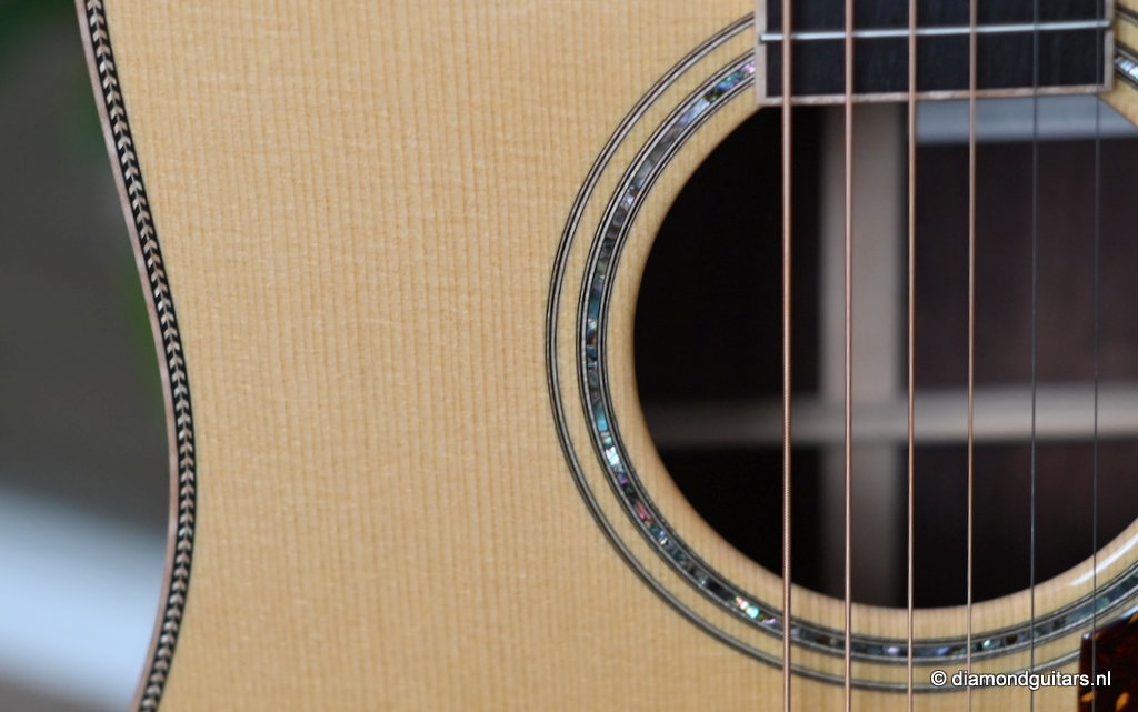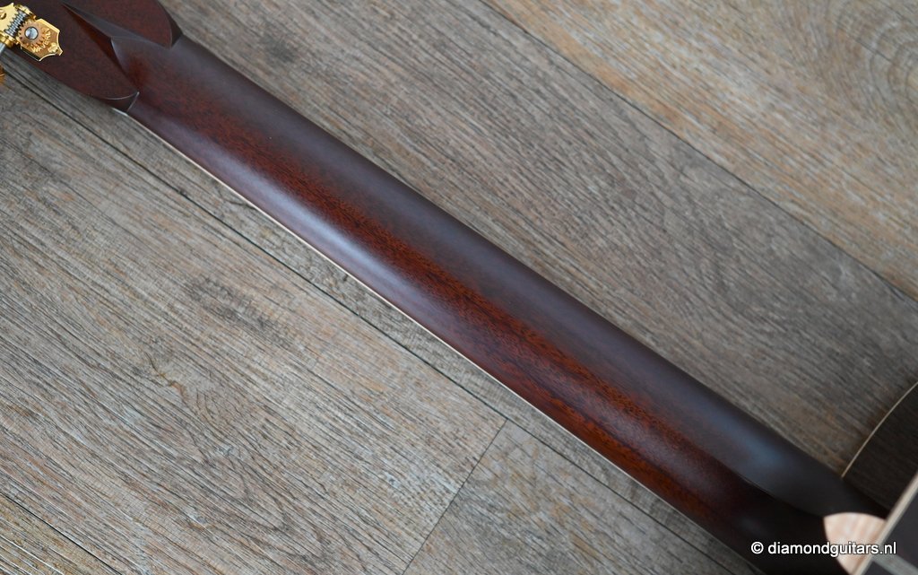 We asked Richard to couple this unique tonewood with a set of tight grained Germand Spruce. German spruce has an even response across the frequency spectrum. Clear treble, strong but not boomy bass, and a sweet, singing midrange. The combination produces rich overtones and a “shimmer” that develops with age and playing. Also, she responds quickly to a light touch resulting in versatile dreadnought. The Mahogany neck has a slight V shape and plays like butter. To top that off, we added the classic Abalone Torch to the headstock. Not only a great companion for singer/songwrites, fast playing flatpickers and even fingerstylers but also a absolute beauty to look at. Sound impression coming soon.