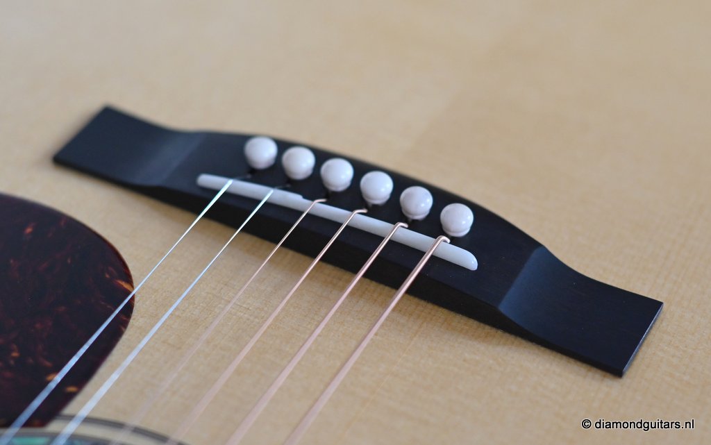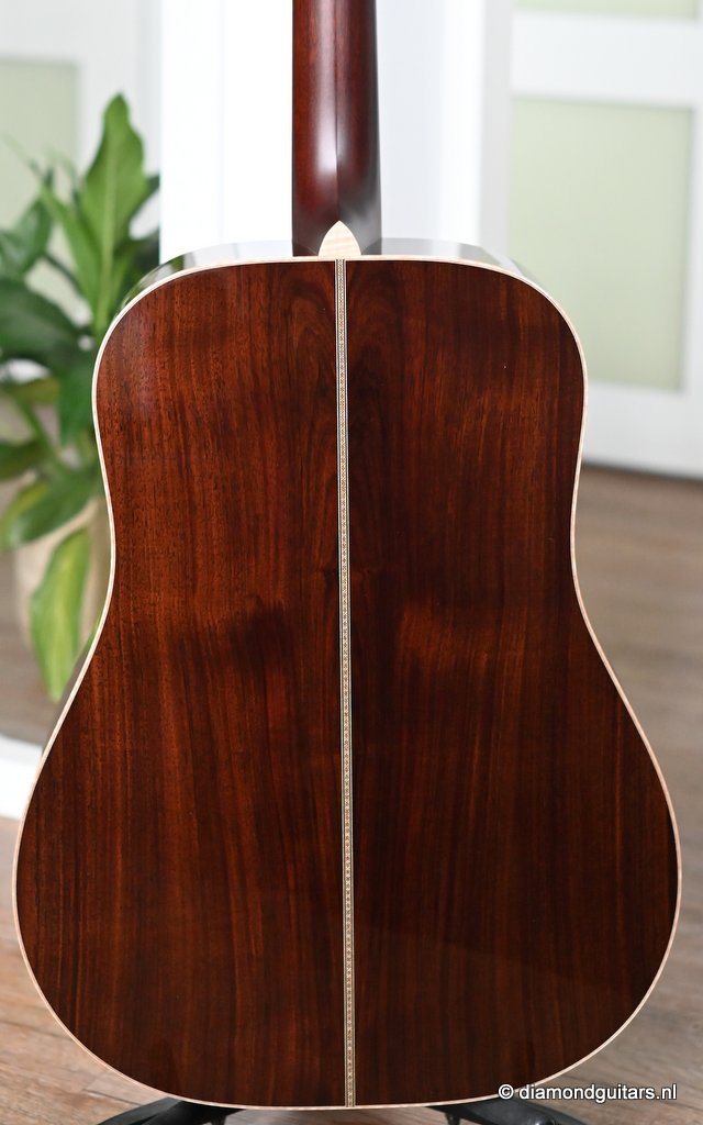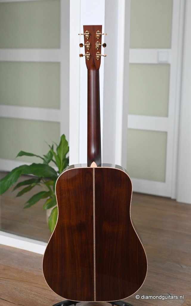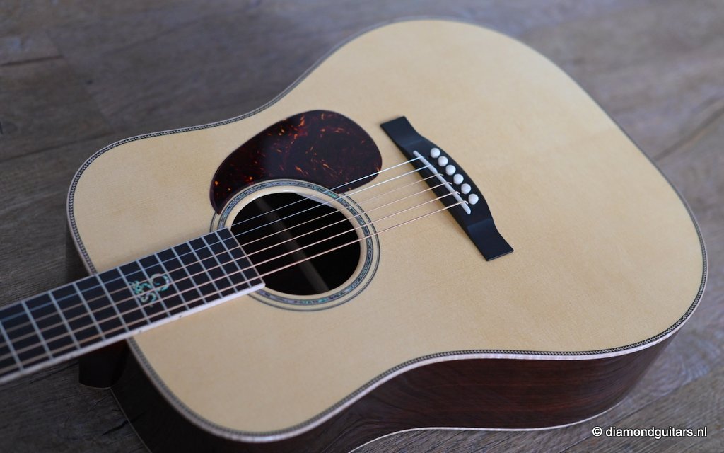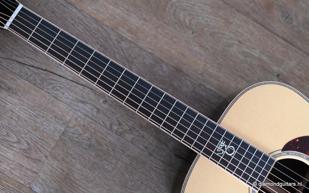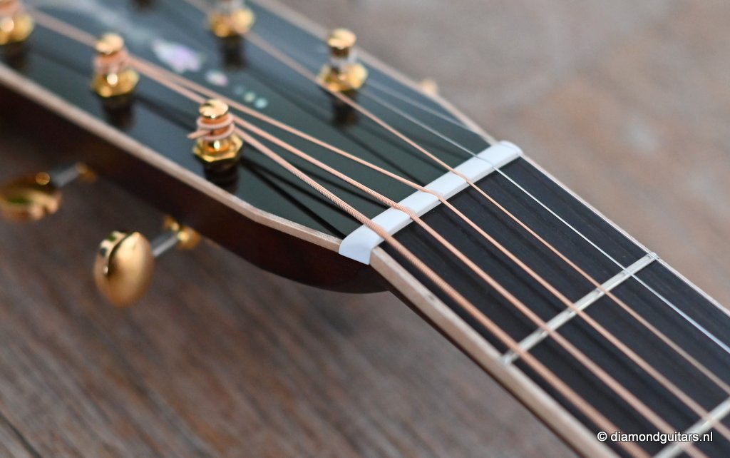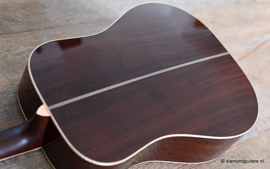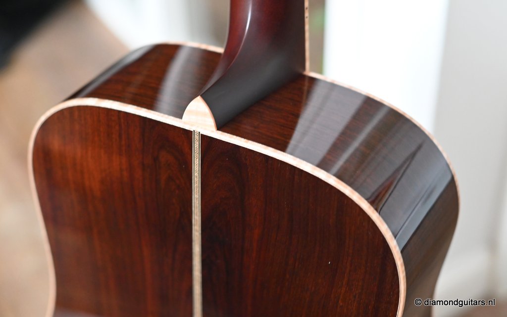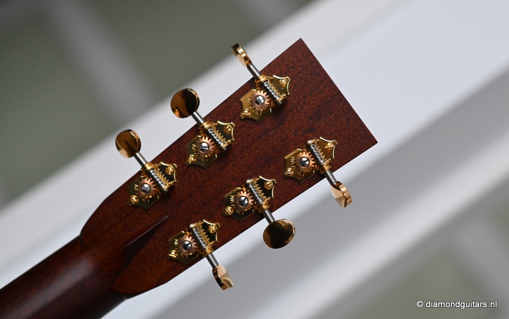 We asked Richard to couple this unique tonewood with a set of tight grained Germand Spruce. German spruce has an even response across the frequency spectrum. Clear treble, strong but not boomy bass, and a sweet, singing midrange. The combination produces rich overtones and a “shimmer” that develops with age and playing. Also, she responds quickly to a light touch resulting in versatile dreadnought. The Mahogany neck has a slight V shape and plays like butter. To top that off, we added the classic Abalone Torch to the headstock. Not only a great companion for singer/songwrites, fast playing flatpickers and even fingerstylers but also a absolute beauty to look at. Sound impression coming soon.