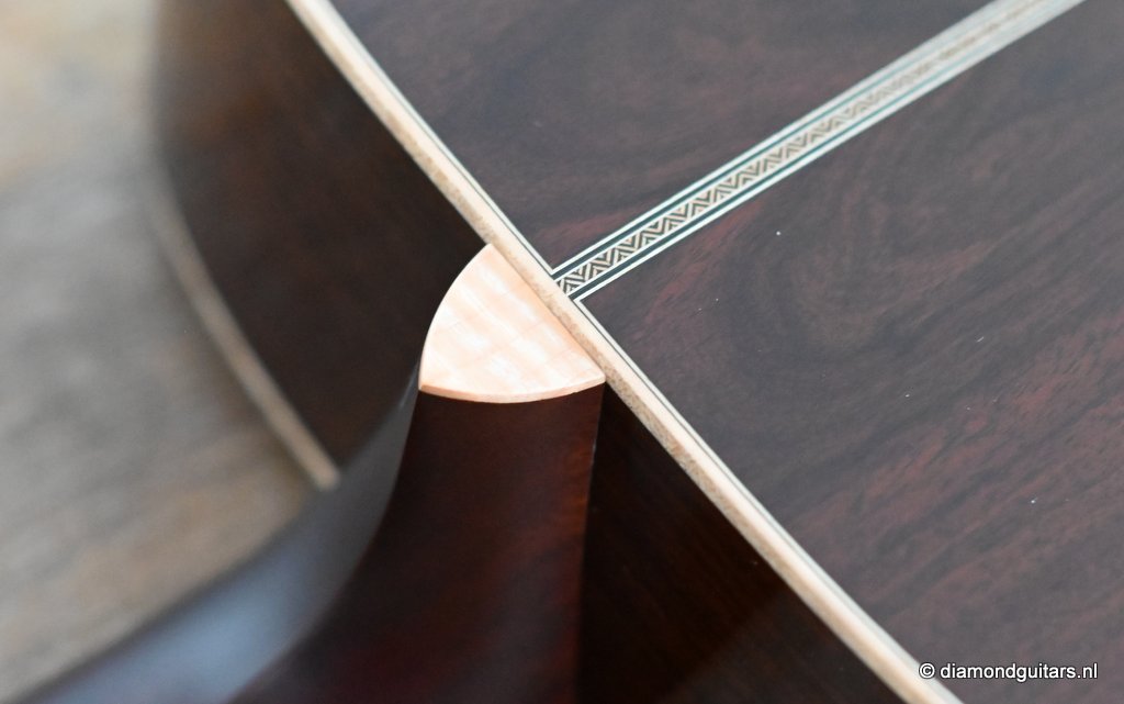 She is build with a set of wood that originated from a virgin wood that was cut in India in the 1800s. An English trader shipped the wood to the US to be used for building the Bryn Anthem Cathedral near Philadelphia, PA. Slow, steady, uniform growing wood is denser and more resonant than today’s fast-growing Indian Rosewood on plantations. The wood Richard was offered were left over planks of the construction and stored for more than 100 years in the church storage. While today’s Indian Rosewood offers a little slower response, warmth and more blended tone, this Rosewood is brighter, clearer and more articulate. In fact, this Rosewood only differs visually from Brazilian Rosewood. This century’s old wood is just as light and dense as Brazilian. With my eyes closed, it is impossible to separate from Brazilian Rosewood. Listen to Richard‘s story on this wood HERE.
