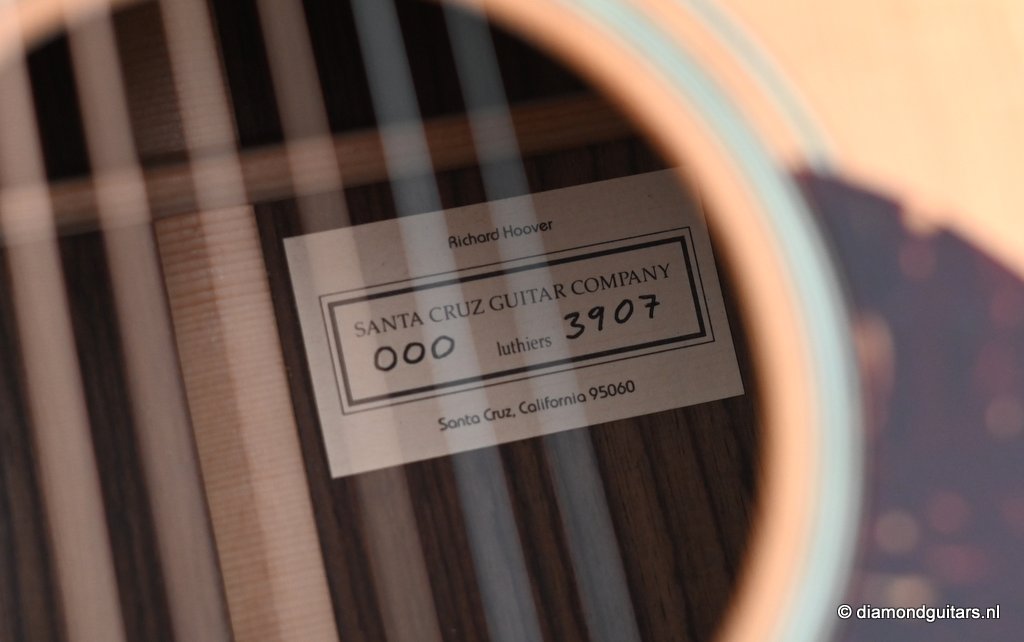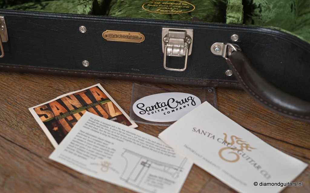 This Santa Cruz 000 12-fret is a beguiling guitar. This twelve-fret 000 concepts has a rich and complex voice, colored with beautiful overtones and expressive subtleties. It’s had a few years to open up and mature, and has become a remarkable sounding instrument with a glorious sustain and a piano-like clarity. The OOO is the 12-fret predecessor of the OM. If access past the 12th fret is of no concern, the OOO adds some distinct advantages tonally and cosmetically. The extension of the body to the 12th fret adds additional airspace, which translates into increased sound volume and a more predominate bass in the EQ. The slotted peghead is a standard feature that adds classic styling. The peghead reduces mass and accentuates the guitar’s open, airy ambiance, making it a fingerstyle favorite.